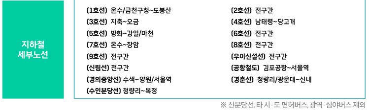 버스 경우 서울시 면허 시내버스, 마을버스인 경우 모두 무제한 이용이 가능합니다. 하지만 인천이나 경기도 등 다른 시나 도 소속의 버스 경우 이용이 제한됩니다. 심야버스와 광역버스 또한 요금체계가 달라 이용이 제한됩니다.